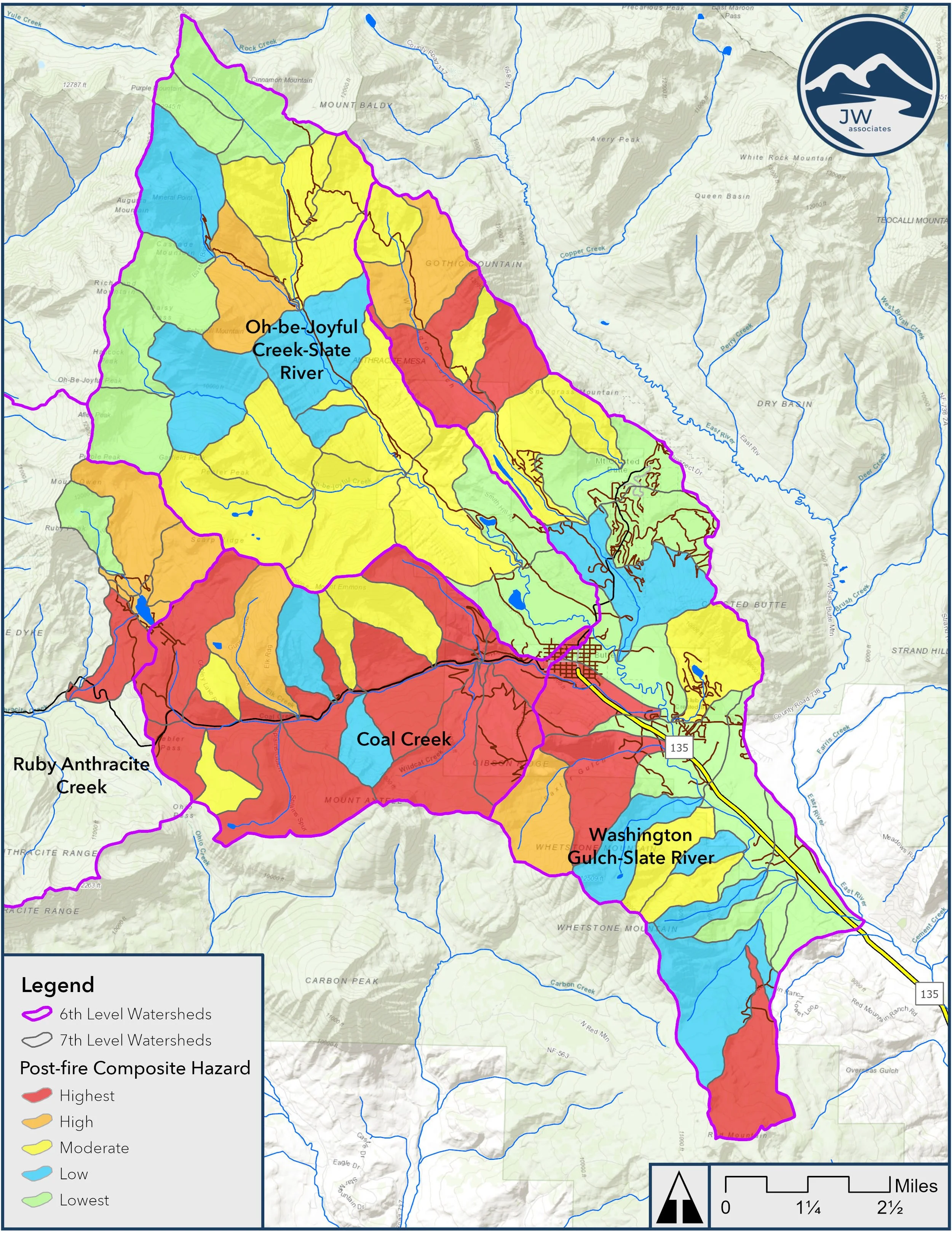 Post-fire debris flow hazards were estimate for all 7th level watersheds in the Crested Butte WRAP area. This information provides guidance for planning and mitigation of debris flow hazards in a post-fire scenario.