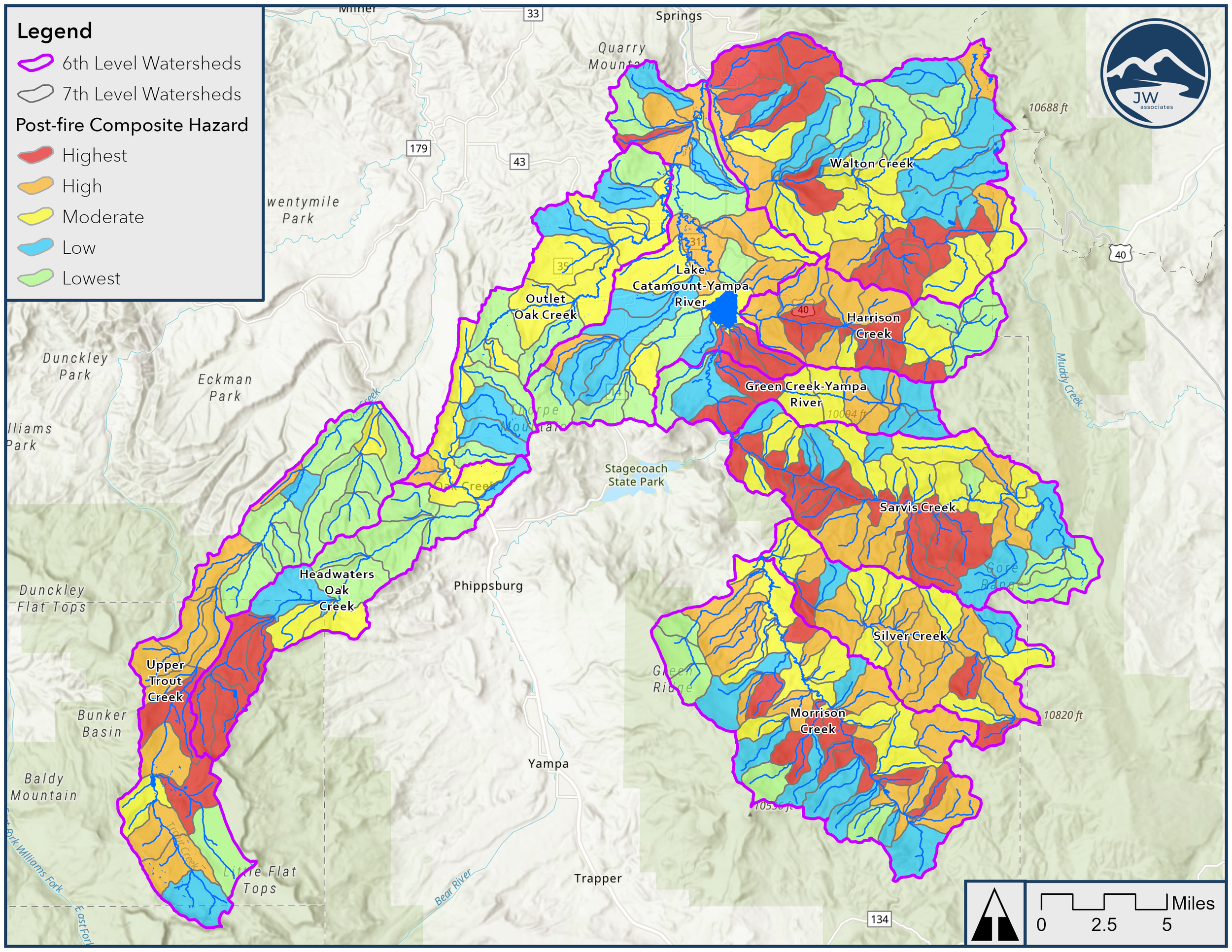 Post-fire debris flow hazards were estimated for all 7th level watersheds in the Steamboat Front WRAP project area. This information provides guidance for planning and mitigation of debris flow hazards in a post-fire scenario.